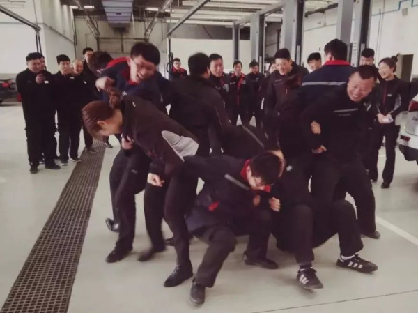 3月16日上午8點(diǎn)30分,在東新奧迪的售后車間便舉辦了這樣一場(chǎng)形式新穎地互動(dòng)型晨會(huì)。當(dāng)同事們得知今天的晨會(huì)還有做游戲,一個(gè)個(gè)臉上都露出了期待的表情。隨著服務(wù)總監(jiān)一聲令下,所有人迅速分成了四組,每組首先選取四個(gè)人背靠背坐在地上,四人相互挽著胳膊,當(dāng)聽(tīng)到起立口令的時(shí)候,用腿以及后背的力量站起來(lái),以后每組依次增加2人。當(dāng)每組達(dá)到10個(gè)人的時(shí)候,想要全部站起來(lái)非常不容易。